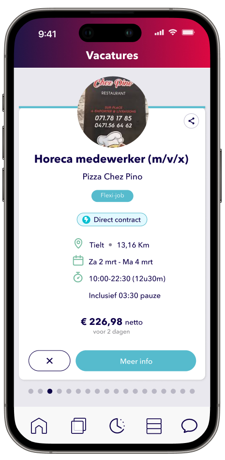Je krijgt dus naast gewone vacatures ook de exclusieve Direct Contract-vacatures te zien. Je herkent ze aan het blauwe bliksemschichtje. Wanneer zo’n vacature je aandacht trekt, kun je ze eenvoudig aanklikken en... direct een contract ontvangen. Ons team heeft jou immers al gescreend en heeft gezien dat jij geschikt bent voor de job! Het enige wat je nog moet doen, is je voorbereiden op je shift. Bij de planning in je app zie je waar en wanneer je verwacht wordt.