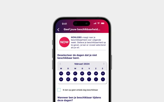 In de NOWJOBS-app voeg je eenvoudig je beschikbaarheid toe, zodat je enkel de vacatures ziet voor momenten waarop je kan werken. Dat kan door op je profielfoto of -naam te klikken, naar ‘Werkvoorkeuren’ te gaan en dan op 'Kalender' te klikken. Óf je kan gewoon op de ‘to do’ op je homepagina klikken. Die leidt regelrecht naar je kalender. Bovendien kun je ook dagen en uren aanduiden waarop je niet beschikbaar bent. Zo wordt je vacature-overzicht nóg duidelijker!