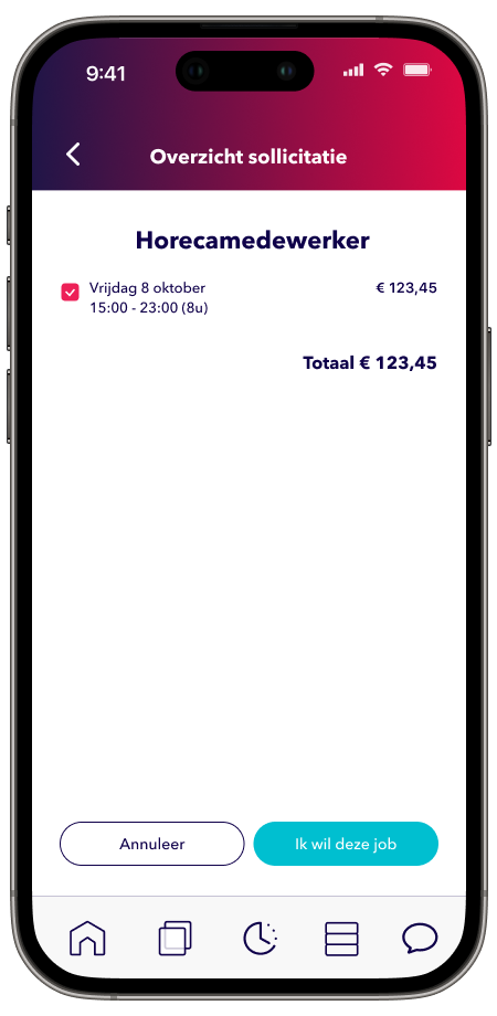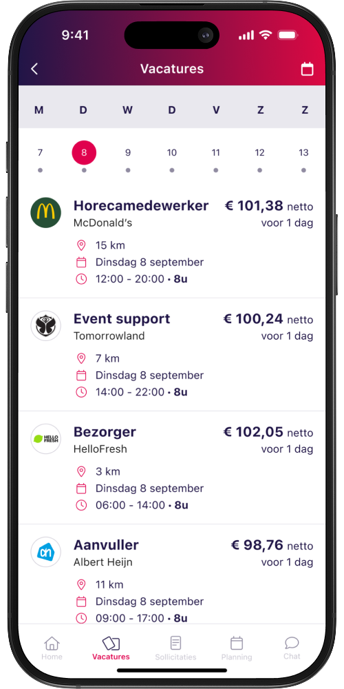 Download de app, swipe door vacatures van bedrijven bij jou in de buurt en start meteen als jobstudent, flexi-jobber of bijverdiener. Did you get the job done? Dan staat je loon vliegensvlug op je rekening.