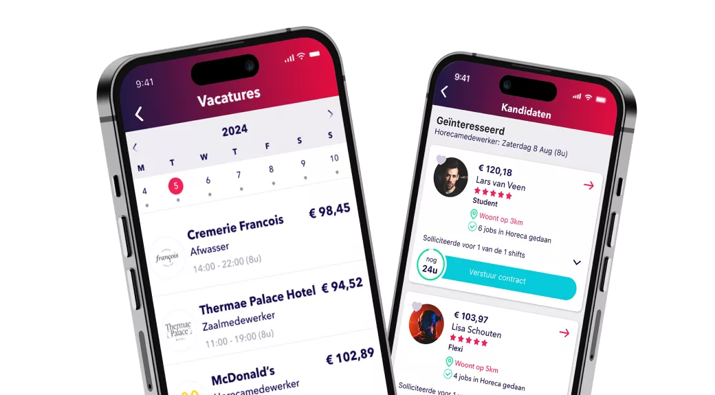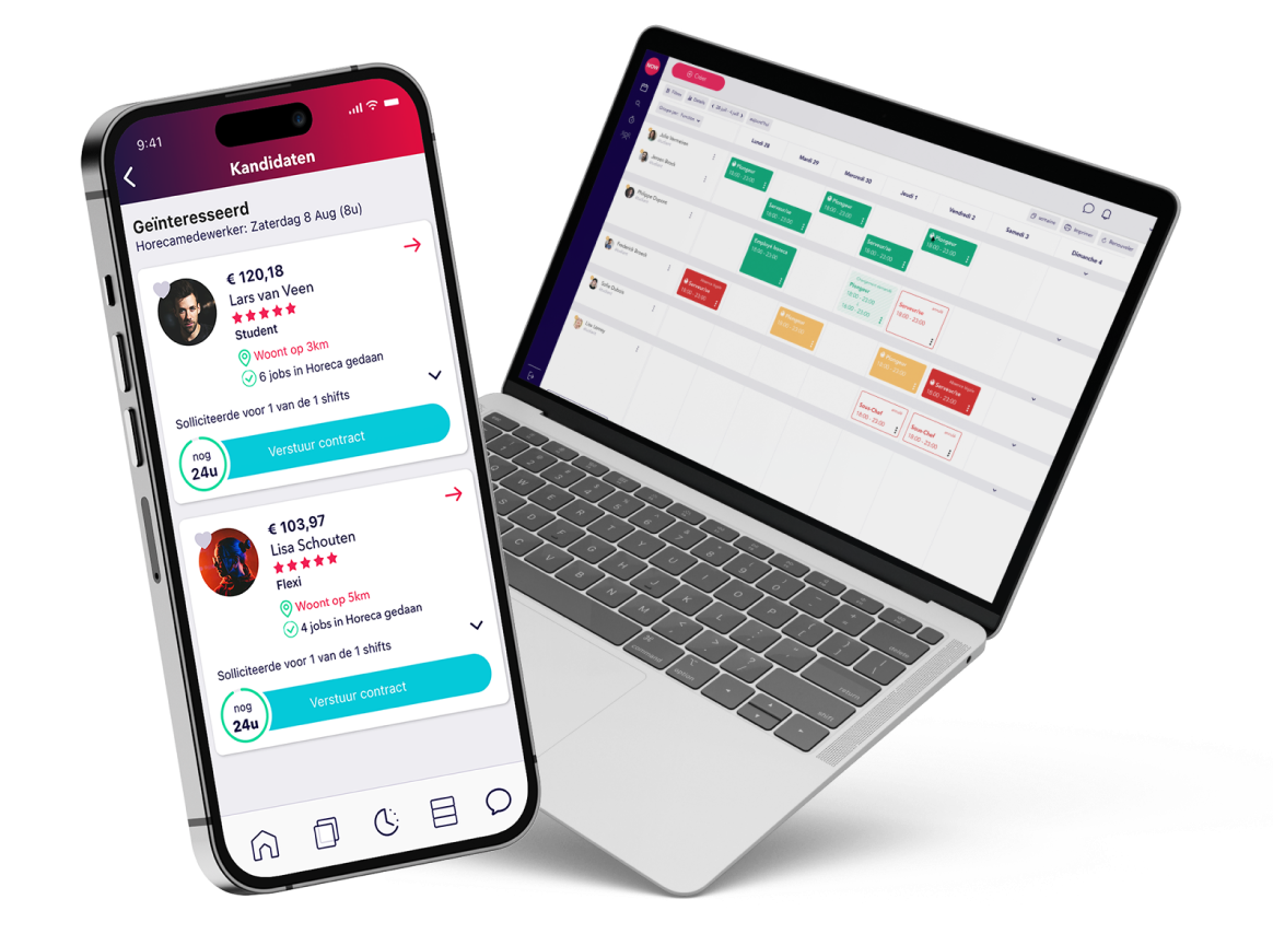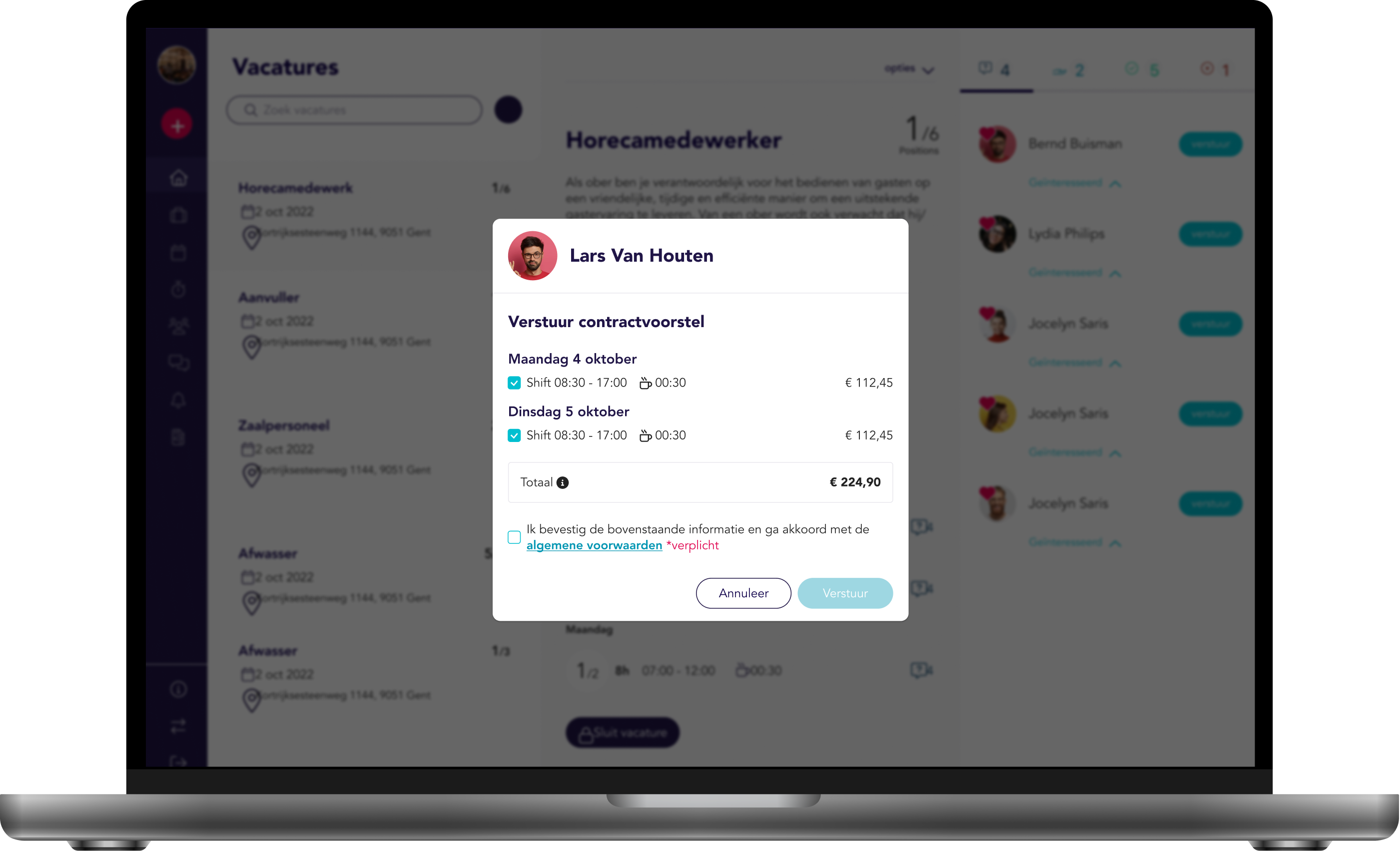 Jij hebt het webplatform, bijverdieners hebben de app, wij maken de verbinding! We koppelden het webplatform met de app, zodat je via je computer of laptop nog makkelijker je team kan beheren. Plaats je vacature en vermeld wanneer je hulp nodig hebt, welke functie openstaat en hoeveel personen je zoekt. Et voilà: de sollicitaties lopen al snel binnen. Gemiddeld krijg je er 15 per vacature!
