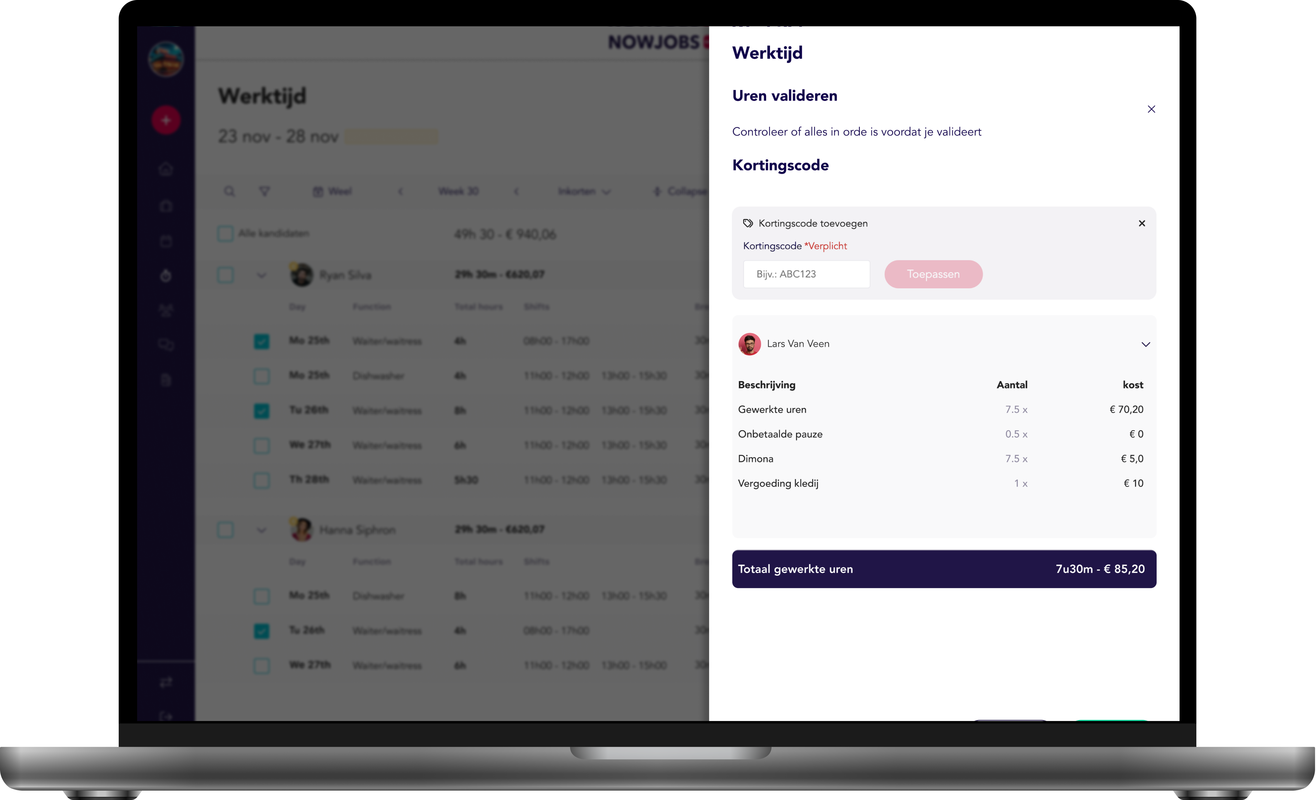 Het webplatform is uitgerust met een online planningstool en tijdsregistratiesysteem. Zo kan je vlot een uurrooster maken, het overzicht bewaren en inspelen op onverwachte verschuivingen. Als je meer dan 10 bijverdieners wil inplannen, is het webplatform de makkelijkste en overzichtelijkste optie. De app toont je een vereenvoudigde versie.