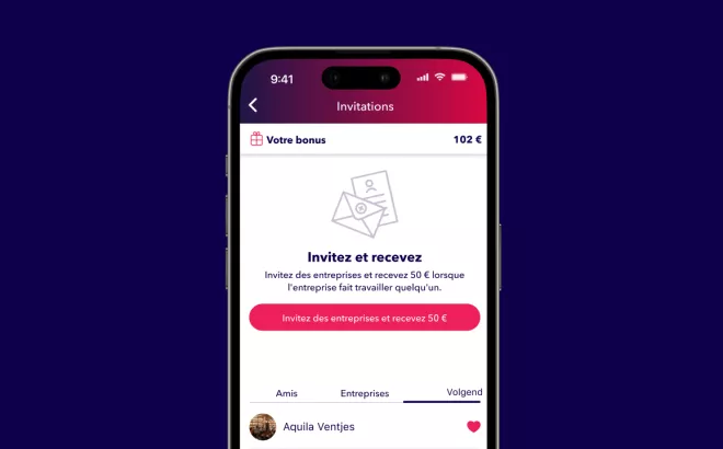 Pour chaque entreprise qui s'inscrit sur NOWJOBS grâce à vous et qui engage quelqu'un pour travailler, vous recevrez une réduction de 50 € sur votre prochaine facture. Ils bénéficient d'une aide supplémentaire, vous bénéficiez d'une réduction !