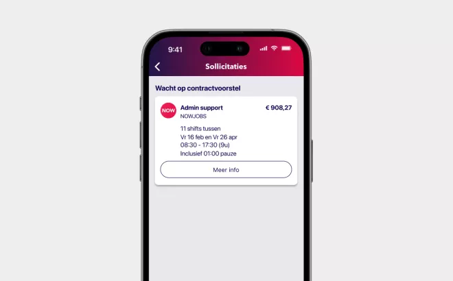Je krijgt sowieso feedback, wat de werkgever ook beslist. Werd je gekozen? Dan ontvang je snel een contractvoorstel. Zodra je dat voorstel om te werken accepteert, verschijnen de details van de job bij je planning in de app. Ook wanneer je niet gekozen werd, krijg je meer informatie. Concreet ontvang je één van deze notificaties: