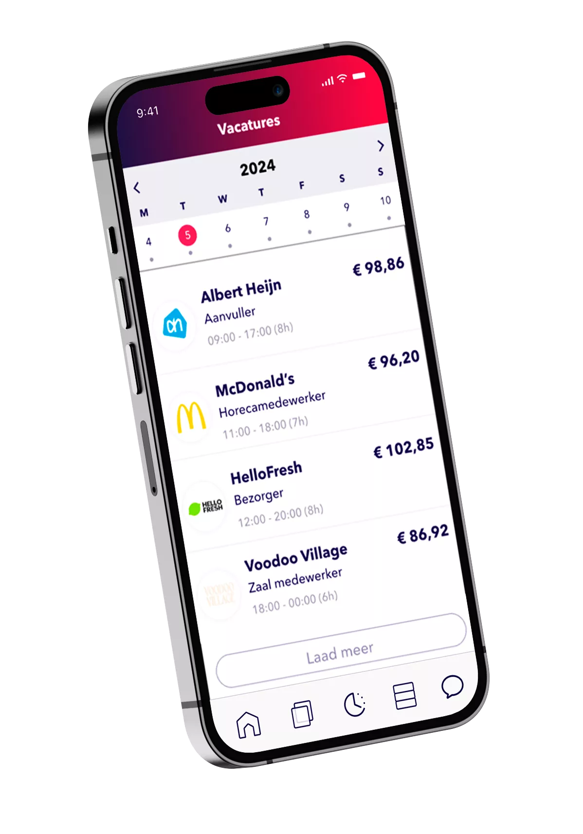 Tijdens de rust van een sportwedstrijd, op toilet of in de les: met de app kun je altijd en overal jouw flexi- of studentenjob scoren.