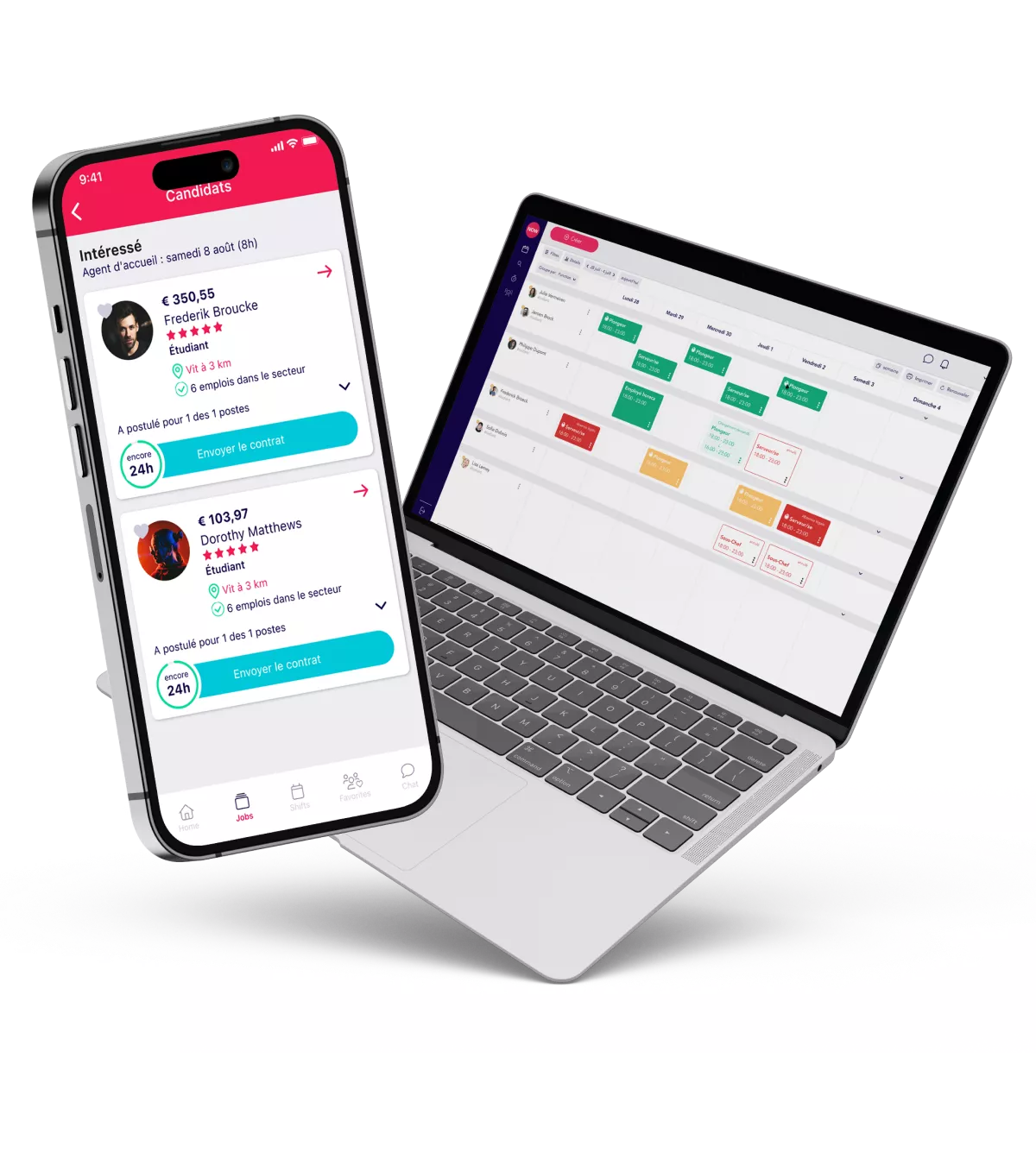 Publication des offres d'emploi, analyse des candidatures et envoi des contrats : tout se fait en ligne via notre portail web ou notre application.