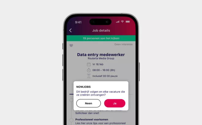 Wanneer je in de NOWJOBS-app door de vacatures swipet, zie je interessante jobs bij bedrijven uit jouw buurt. Hoe ver die zaken van je verblijfplaats verwijderd zijn, is afhankelijk van de kilometerradius die je in je instellingen hebt ingesteld. Door jouw favoriete bedrijven te volgen, ontvang je als eerste alle toekomstige vacatures! Zo solliciteer jij straks met voorsprong.